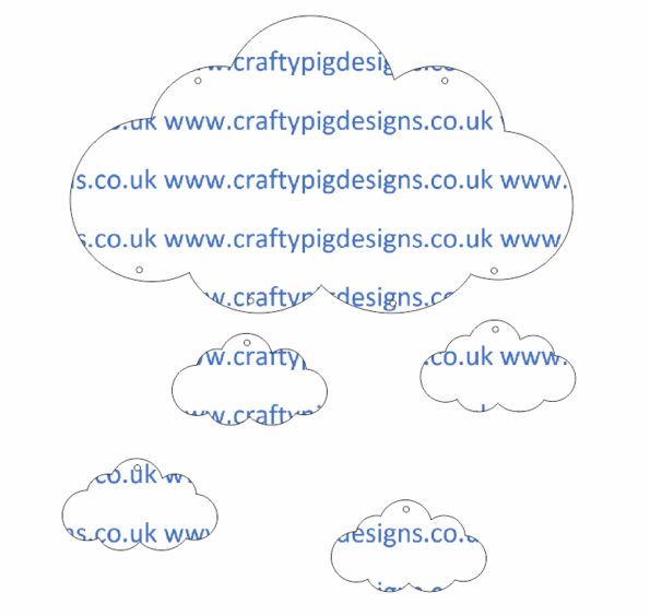 large cloud 25cm wide smaller clouds 57.5mm wide all come with 3mm holes for ribbon.
