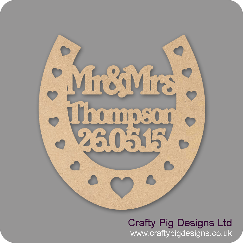 3mm MDF Wedding Horseshoe with heart cut outs (personalised with surname and date)
