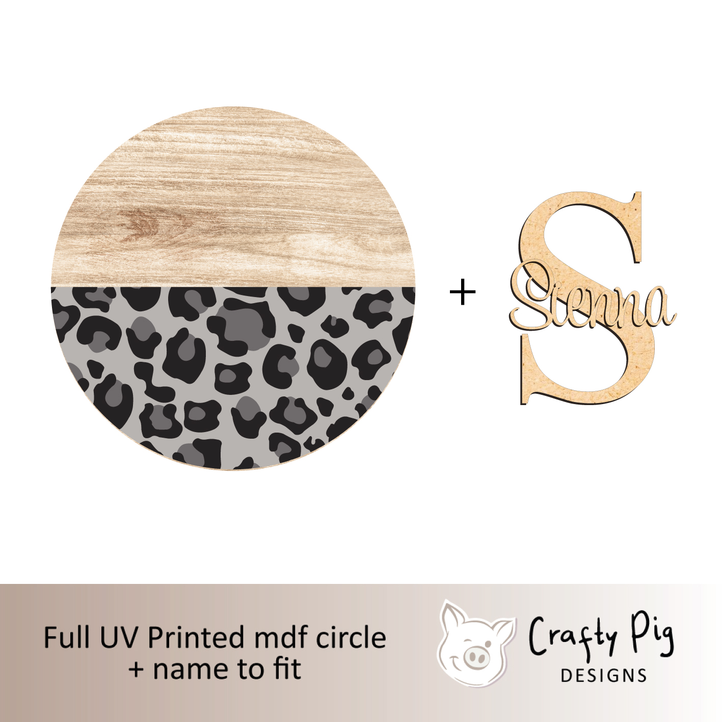 Printed Wood Effect and Grey Leopard Effect circle with Letter and Name