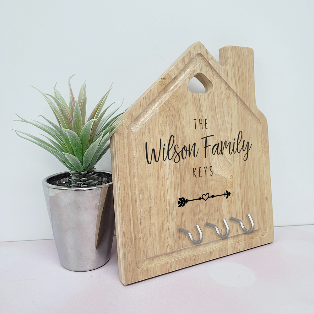 A gorgeous House Shaped Board with key hooks and personalised with surname.
